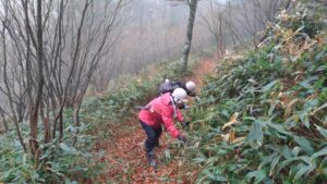 成就地区に到着し、まず第二園地周辺の下草や笹刈りを行いました。当月上旬に違う団体の方たちが下草刈りをしていたためか道中はきれいになっており、活動範囲は狭くなりましたが出来る範囲内で作業を行いました。引き続き、第一園地周辺を散策しました。