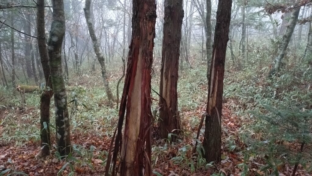 まずは自然観察(ほぼ落ち葉の中)をしつつ登山道を進みました。やはり昨年同様、道中のリョウブの木には多くのシカの皮剥の跡がありました。また違う場所では、檜の皮も被害に遭っており痛々しく感じました。